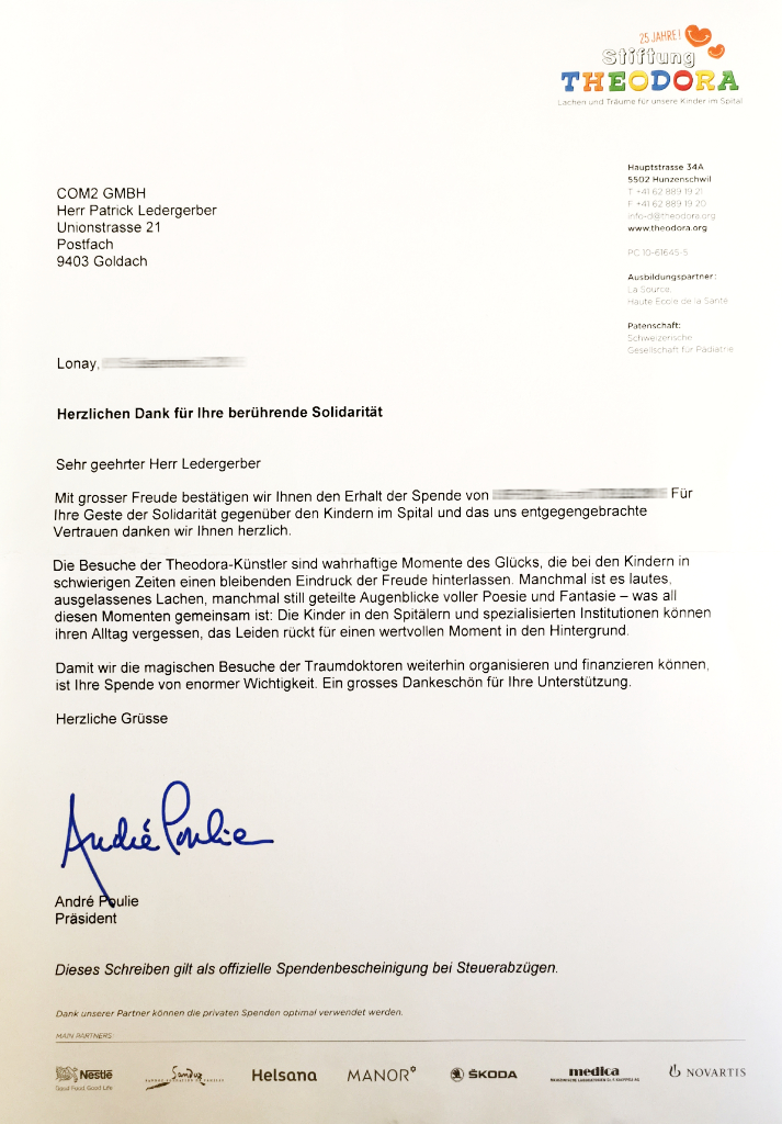 Die Stiftung Theodora verfolgt seit 1993 das Ziel, den Alltag von Kindern im Spital und in spezialisierten Institutionen durch Freude und Lachen aufzuheitern. Jährlich schenken die Traumdoktoren auf tausenden Kinderbesuchen Lachen und Momente des Glücks.
